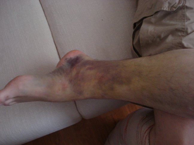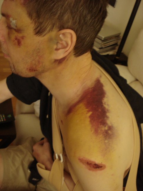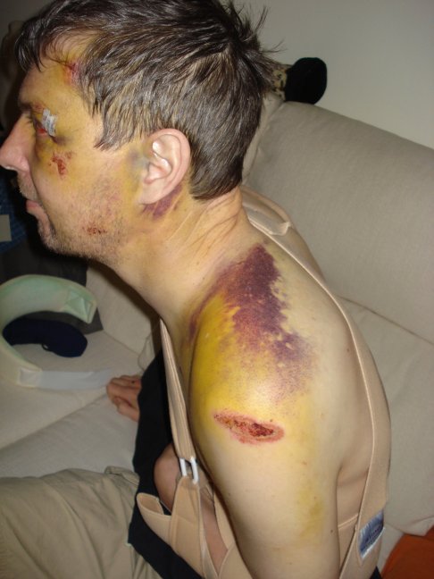 If you want to see photos, scroll down. Nothing too bad there, just some nasty bruising and a few cuts.
