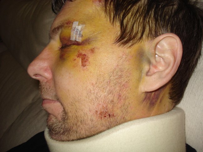Facial bruising, swelling and cuts, 4 days after accident - had to wear neck brace only for a few days