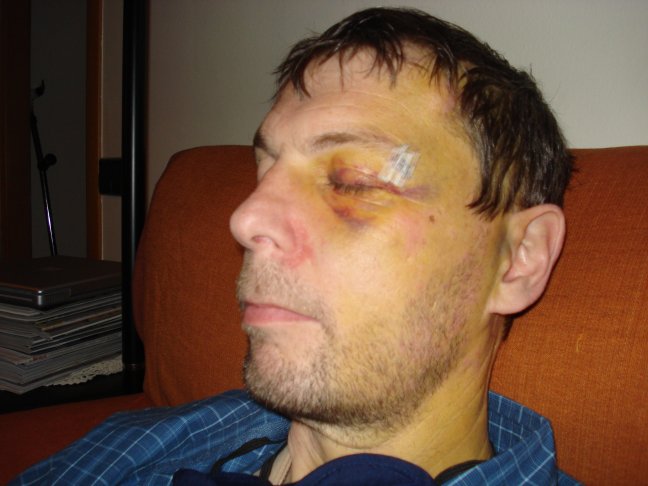 left eye, a badly-bruised left leg and 4 broken metatarsals on